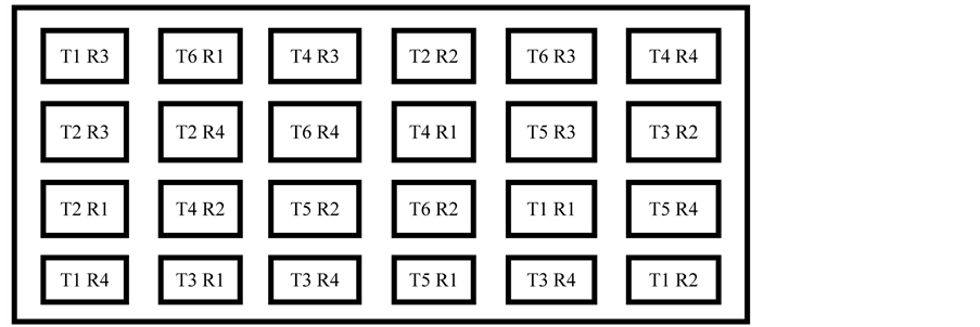 covered with soil to prevent its wash away with winds. In each plot, six seedlings of Salsola species are planted, these species are the predominant wild plant for arid regions of Jordan. Figure 2 shows the schematic of the experiment where T1 is the control, T2 is 10 tons/ha application, T3 is 20 tons/ha application, T4 is 30 tons/ha application, T5 is 40 tons/ha application, T6 is 60 tons/ha application, and R1 to R4 are the replicates for each application load.