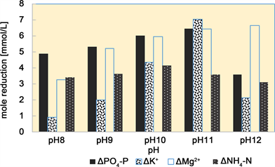 Needle-like crystals not seen at pH 8 became visible at pH 9, and the needle length increased and more needle-like crystals were present at higher pH values. The decreases in the P and K concentrations in the liquid increased as the pH increased from pH 8 and reached a maximum at pH 11, but then decreased when the pH was increased to pH 12. Figure 4 shows the decreases in the concentrations of the components of the solution at different pH.