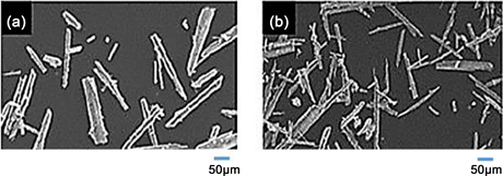 Figure 6. Electron micrographs of the crystals in (a) the reactor and (b) the settling tank.
