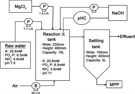The MPP crystallization method has been used for wastewater with a high phosphorous concentration (30 mM or more, e.g., in urine) and a high potassium concentration [8] . Wastewater treated using activated sludge contains a low ammonium concentration, so it is difficult to use the MAP method to remove phosphorous from treated water. However, the relatively high K concentrations in wastewater treated using activated sludge can be appropriate for MPP treatment. The MPP treatment method has been used to remove relatively low phosphorus concentrations from wastewater treated using activated sludge in very few studies. The optimum pH for MPP treatment depends on the target phosphorous concentration because hydroxy ions are involved in the solubilities of the products. The optimum pH for treating wastewater containing 30 mM P in synthetic urine to give an equimolar precipitate of P, Mg, and K is pH 8 [8] [9] , and the optimum pH for treating synthetic wastewater containing 7.6 mM P is pH 10 [10] . In the study described here, a P concentration of 6.5 mM was used to approximate the typical concentration in livestock wastewater, and the effects of the pH, Mg dosage, and coexisting substances on the formation of MPP were investigated using an experimental system that consisted of a reactor and a settling tank. The synthetic wastewater was designed to simulate effluent from piggery wastewater treated with activated sludge [11] .