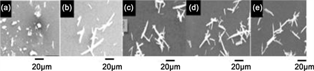 Figure 3. Electron microscopy images of crystals produced at different pH values. ((a) pH 8; (b) pH 9; (c) pH 10; (d) pH 11; (e) pH 12).