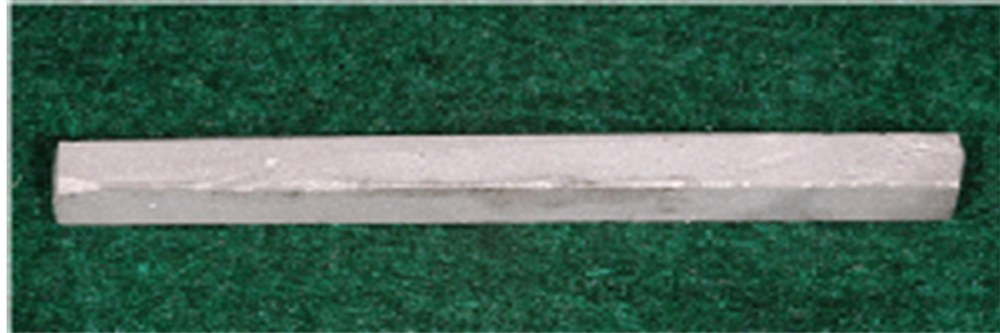 Initially, bars of acrylic resin were obtained using a steel frame 8 cm length × 4.8 mm width × 4.3 mm in thickness, worn and controlled by a MAUb caliper. Each bar was sectioned in the middle originating two bars with 4 cm, ready for casting. Thus 30 bars were obtained and divided into two groups with 15 bars to test new alloys (NA) and 15 to test recast alloys (RA) (Figure 1).