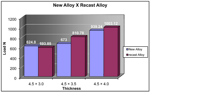 ・ There is statistical significant difference between the new and recast alloys and among the thicknesses of the bars;