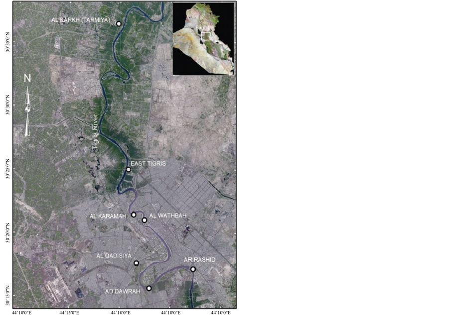 Tigris river water is considered the only source of potable water for the city of Baghdad, and the river divides the city into right (Karkh) and left (Risafa) sides with a flow direction from north to south. The study area within Baghdad City is located in the Mesopotamian alluvial plain between latitudes 33˚14'N - 33˚25'N and longitudes 44˚31'E - 44˚17'E, 30.5 to 34.85 m at sea level (a.s.l). The area is characterized by arid to semi-arid climate with dry hot summers and cold winters; the mean annual rainfall is about 151.8 mm [13] . In Baghdad city, a tremendous increase in freshwater demand is required due to the rapid growth in population and accelerated industrialization. The quality of the following water is affected by the pollution increase in the river stretch due to effluent discharges by various uncontrolled sources as domestic, industries, agriculture along the downstream stretch. Therefore treated water quality from WTPs monitoring is necessary to evaluate the treated water stability.