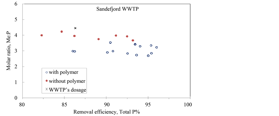 The filled circles in Figure 2 present the tests without polymers and empty circles refer to tests with cationic polymers. The single cross in each figure refers to the dosage which the WWTP was using at the sampling time. In all three WWTPs this ratio was between 4 and 5, which is quite high compared with the synthetic wastewater. A survey among average molar ratios used in ten Norwegian WWTPs revealed values between 2.0 - 5.0 with exception of one WWTP [15] . Compared with the theoretical requirement of 1 mole of aluminium per 1 mole of phosphates in aluminium phosphates, these values are much higher. On the other hand, the Al: P ratio will always be higher than 1 during the efficient phosphate removal by coagulation, as a part of aluminium end up in aluminium hydroxide making it unavailable for phosphate removal [16] .