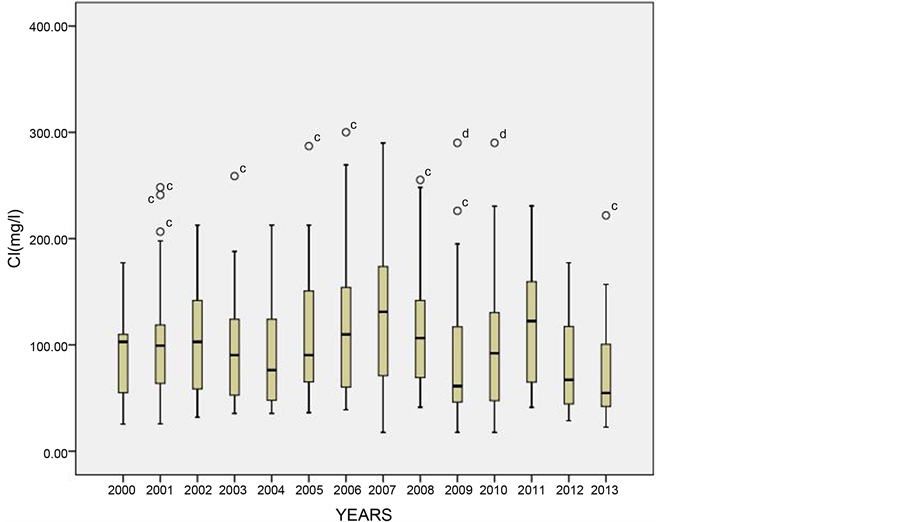 The Chloride was measured as the lowest in the Adıgüzel Dam (50.81 ± 16.45d mg/l) and it was measured as the highest in the Sarayköy Bridge (160.14 ± 60.24a mg/l), which is given in Table 2. The differences were observed to be significant in all of the 8 stations (p < 0.05). The Chloride was measured as the lowest (72.85 ± 44.10e mg/l) in 2013 and it was measured as the highest (130.20 ± 66.44a mg/l) in 2007. The annual differences were found to be statistically significant (p < 0.05) (Figure 5). Water quality at Adıgüzel Dam was I. class in terms of COD values while Sarayköy Bridge was II. Class. Chloride value in all the years is compatible with the value proposed by TS 266 and WHO guidelines. For freshwater fish, however, the concentration of chloride should not exceed 860 mg/L [8] . All Cl− values recorded in sampling stations in Büyük Menderes River were below the maximum permissible level for protection of aquatic life.