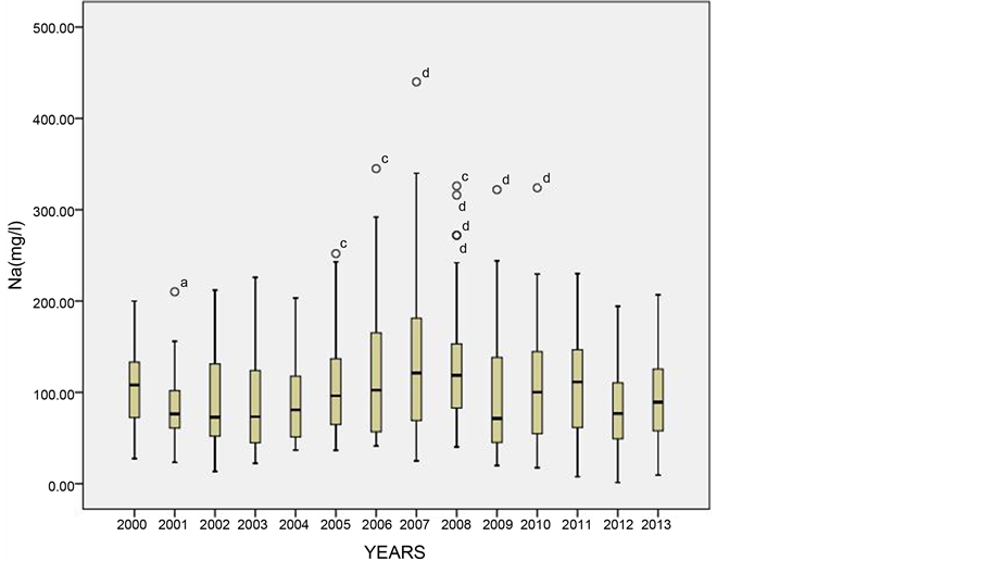The Sodium was measured as the lowest in the Yenice regulator (75.26 ± 36.50b mg/l) and it was measured as the highest in the Feslek Regulator (153.30 ± 73.76a mg/l), which is given in Table 3. In all of the 8 stations, significant differences were determined in the annual pH levels (p < 0.05). The Sodium was measured as the lowest (83.08 ± 36.44d mg/l) in 2001 and it was measured as the highest (139.85 ± 87.51a mg/l) in 2007. The annual differences were found to be statistically significant (p < 0.05) (Figure 6). In terms of sodium, the water of Büyük Menderes river can be classified as “class I” according to the TWPCR. Sodium value in all the years is compatible with the value proposed by TS 266 and WHO guidelines. The natural range of sodium ions in water and soil is so low, their existence can show river pollution caused by human activities [9] .