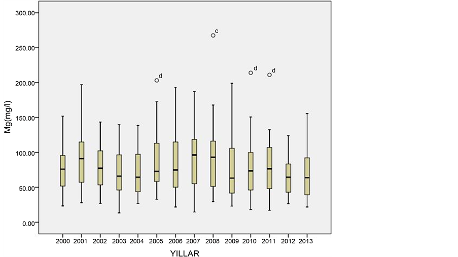 The Magnesium was measured as the lowest at Adıguzel dam (38.65 ± 9.59f mg/l) and it was measured as the highest in the Feslek regulator (109.87 ± 45.58a mg/l), which is given in Table 3. In all of the 8 stations, significant differences were determined in the annual pH levels (p < 0.05). The Magnesium was measured as the lowest (65.58 ± 27.38d mg/l) in 2012 and it was measured as the highest (92.74 ± 41.32a mg/l) in the year 2007. The difference per annum was found to be statistically significant (p < 0.05) (Figure 8). Furthermore, it was highlighted that the amount of magnesium which is found in 95% of water with 14 mg/l magnesium. In addition, it is probable that 100 mg/l - 400 mg/l of poisoned magnesium was found in fresh water. In retrospect, fresh water fish which are found in 1000 mg/l magnesium can also be found salty water which includes sodium and calcium [12] .