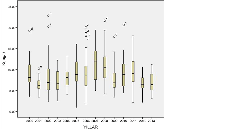 Büyük Menderes River is poor in potassium and plankton growth is so low. The Potassium levels were measured as the lowest in the Adıguzel Dam (6.20 ± 1.27c mg/l) and they were measured as the highest in the Feslek Regulator (10.85 ± 3.77a mg/l), which is given in Table 3. In all of the 8 stations, significant differences were determined in the annual pH levels (p < 0.05). The Potassium was measured as the lowest (6.31 ± 1.51e mg/l) in 2001 and it was measured as the highest (11.48 ± 4.09a mg/l) in 2007. The annual differences were found to be statistically significant (p < 0.05) (Figure 9). In terms of potassium, the water of Buyuk Menderes river can be categorized as “class I” as per the regulations in TWPCR.