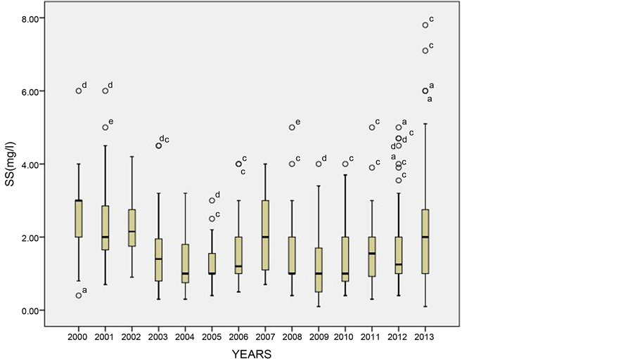 Sophisticated concentrations of suspended solids can assist as carriers of toxics, which readily cling to suspended elements [13] . SS was measured as the lowest in the Yenice Regulator (1.14 ± 0.56d mg/l) and it was measured as the highest in the Feslek Regulator (2.51 ± 1.42a mg/l), which is given in Table 4. In all of the 8 stations, significant differences were determined in the annual pH levels (p < 0.05). SS was measured as the lowest (1.17 ± 0.89e mg/l) in 2009 and it was measured as the highest (2.62 ± 1.10a mg/l) in 2000. The annual differences were found to be statistically significant (p < 0.05) (Figure 13). Therefore, SS value in all the years is compatible with the values proposed by TS 266 and WHO guidelines.