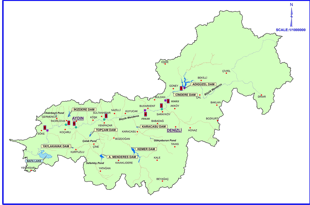 Işıklı Lake, Bafa Lake, and the Büyük Menderes River Delta. It is also a very important river basin in terms of biodiversity, being subject to the effects of both the Mediterranean and continental climates. The locations of the eight stations selected for this study are shown in Figure 1. The stations were chosen deliberately to identify the degradation of the quality of the water as a result of the urban pollution observed in the area. Station 1 is the Adıgüzel Dam. In this dam, there is a certain problem detected in the form of mutations in the genetic structure of the fish and this problem results from the industrial residues which contain leather and textile as well as waste materials coming from Uşak. Station 2 is constituted by the Yenice Regulator. It is 32 km away from the Adıgüzel Dam where pollution stems from domestic waste and pesticides. Station 3 is the Sarayköy Bridge which is influenced by the wastes coming from the Denizli-Sarayköy sewage system, the geothermal plant nearby, and a textile factory. Station 4 is the Feslek Regulator. The Büyük Menderes River is polluted by domestic wastes and pesticide packages coming from the nearby residential and industrial areas. Station 5 is the Yenipazar Bridge which is polluted by the water coming from the Akçay tributary in the Yenipazar Bridge. Station 6 is the Aydın Bridge which is affected mainly by untreated wastewater coming from the industrial zones and municipal sewage treatment plants nearby. Station 7 is the Koçarlı Bridge which merges with the Menderes following the