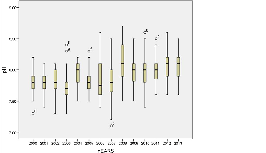 Figure 3. Change graphics of pH values in Büyük Menderes River during 2000- 2013.