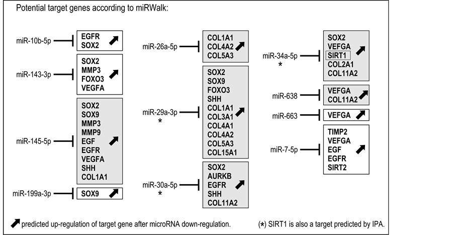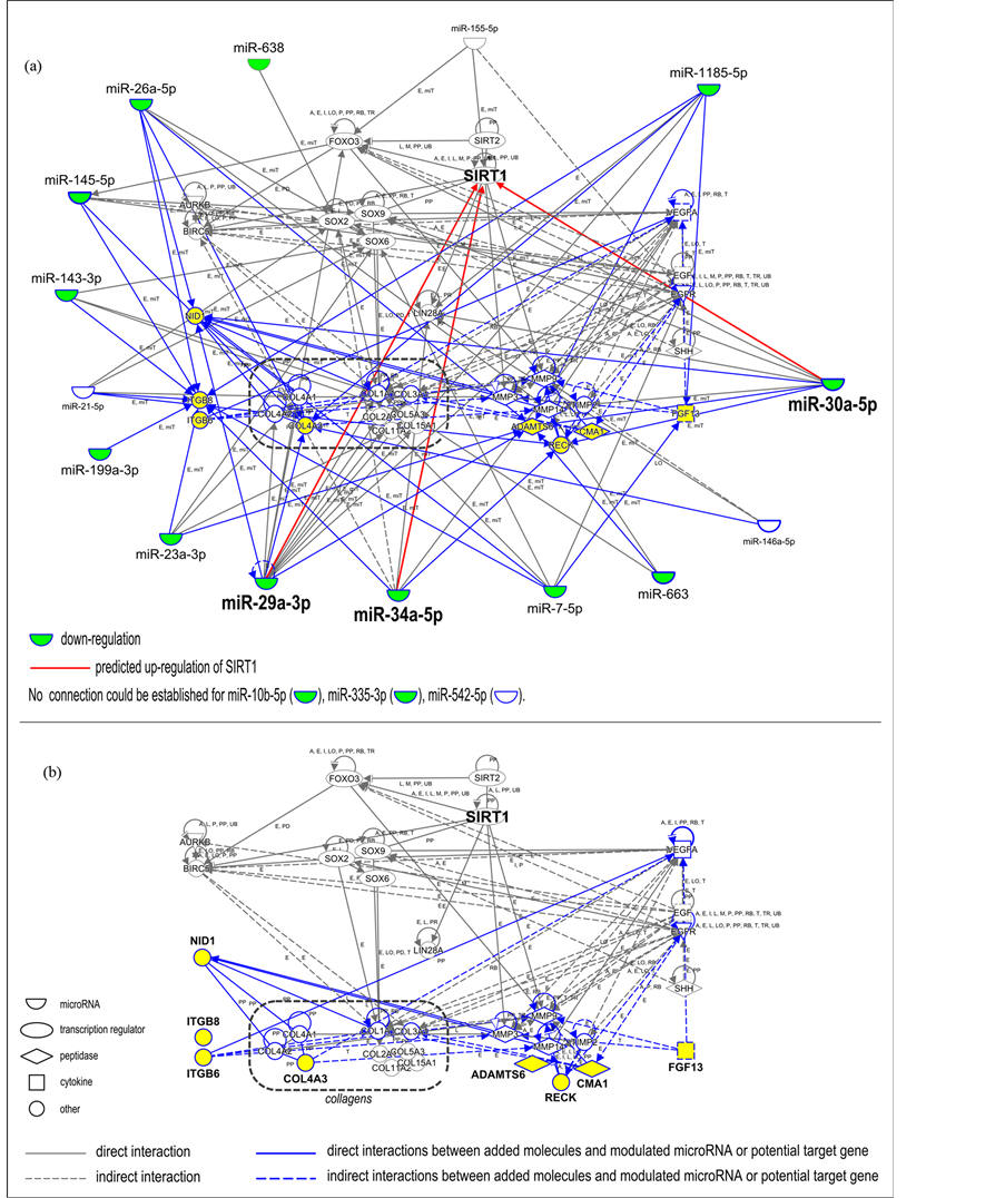 SIRT1, a gene involved in the regulation of cellular senescence, is a miRWalk-validated potential target for miR-34a-5p. Additionally, the Ingenuity® Pathway Analysis predicted that miR-29a-3p and miR-30a-5p may also target SIRT1 and up-regulate its expression, in response to down-regulation (Figure 1).