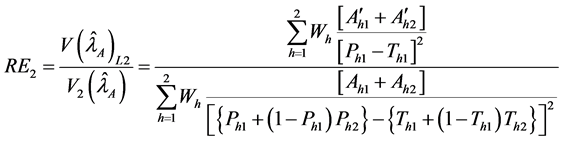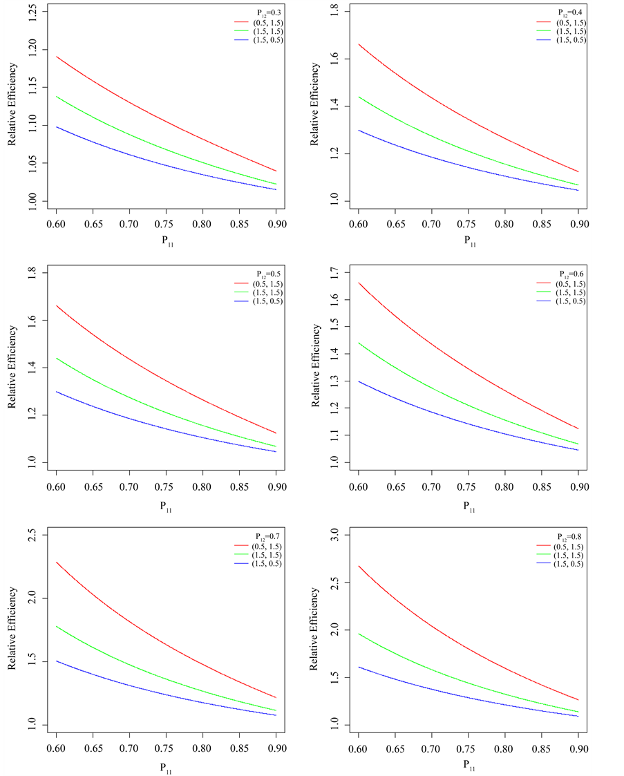 Table 2. Relative efficiency of the proposed estimator with Lee et al. (2013), W1 = 0.4, and W1 = 0.5.