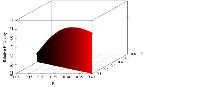 Figure 1. Relative Efficiency (RE) of the proposed model with respect to Lee et al. [4] for W1 = 0.4 and P12 = 0.3 to 0.8.