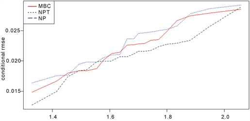 Furthermore, we study the conditional performances of the selected estimators. 500 samples obtained were sorted by the values of the mean of the auxiliary variable and put in 25 groups each containing 20 values. We then compute the bias and root mean square error of each group. The plots of conditional performances against the average of the sorted mean auxiliary variable. We then report the behaviour of the conditional bias for the different bandwidth.