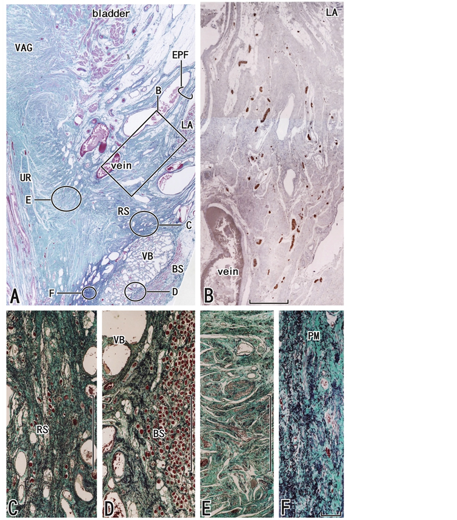 We histologically defined the perineal membrane (PM) as a thick, elastic fiber-rich, smooth muscle-poor membrane extending along the vestibule and lower vaginal wall and embedding the urethrovaginal sphincter and compressor urethrae muscles in accordance with Sasaki et al. [5] . The PM was 0.5 - 5 mm in thickness: it was thick (or thin) near the external orifice of the urethra (or in the superolateral part). The laminar relationship between the striated sphincter and the PM was easy to identify in horizontal sections (Figure 1) and posteriorly the PM ended at the perineal smooth muscle mass. This smooth muscle mass, corresponding to the lateral extension of the perineal body in Soga et al. (2007), is surrounded by the external anal sphincter, rectum and vagina [5] . In contrast, frontal sections were necessary to examine the topographical relationship of the PM to the levator ani and deep transverse perineal muscles (Figures 2-5). Because composite elastic fibers in the PM were recognized as wavy lines and dots in both horizontal and frontal sections (Figure 1(B) Figure 2(B) Figure 3(C) Figure 4(C) and Figure 5(F)), the PM appeared to be made of a dense mesh of elastic fibers. Smooth muscle fibers were seen in the lateral part of the PM (Figure 2(D) Figure 3(B) and Figure 4(B)), but they disappeared in the medial part near the vagina or external orifice of the urethra. Abundant elastic fibers were sometimes evident between the vestibular bulb and the bulbospongiosus muscle (Figure 5(D)), but their density was lower than in the PM and the layer containing elastic fibers along the external aspect of the vestibular bulb was much thinner than the PM (Figure 5(A)).