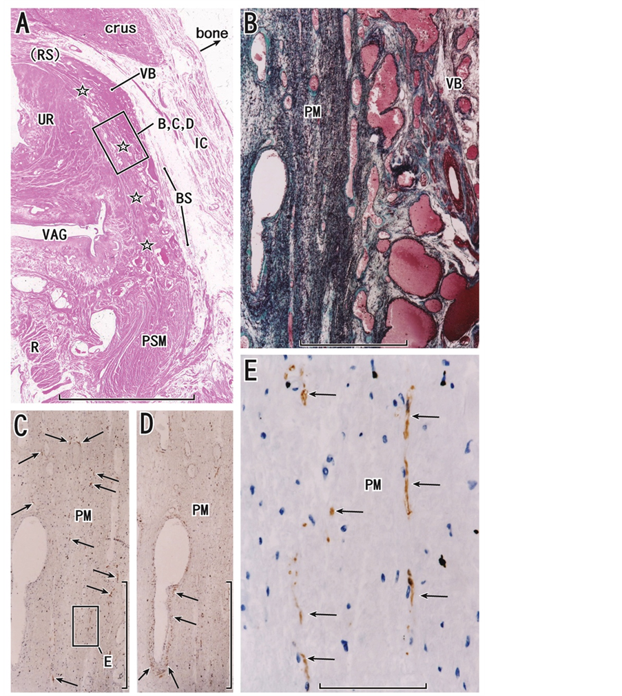Figure 1. Horizontal sections including the distal urethra and perineal membrane. An 82-year-old woman. Panel A (HE staining) displays the topographical anatomy of the perineal membrane (stars) originating from the inferior end of the urethral rhabdosphincter area (RS with parenthesis), extending between the vestibular bulb (VB) and vaginal wall (VAG) and ending at the perineal smooth muscle mass (PSM). The sciatic bone was removed (bone). Panel B (elastica Masson staining), panel C (immunohistochemistry of S100) and panel D (immunohistochemistry of smooth muscle actin), corresponding to a square in panel A, are higher-magnification views of the perineal membrane (PM). The membrane contains abundant elastic fibers (black lines in panel B) and many thin nerves (arrows in panel C), but smooth muscles are restricted in the vascular wall (arrows in panel D). Panel E (immunohistochemistry of S100), corresponding to the square in panel C, is a higher-magnification view of nerves (arrows) in the perineal membrane. Scale bars: 10 mm in panel A; 1 mm in panels B, C and D; 0.1 mm in panel E. BS, bulbospongiosus muscle; crus, crus critoris; IC, ischiocavernosus muscle; R, rectum; UR, urethra.