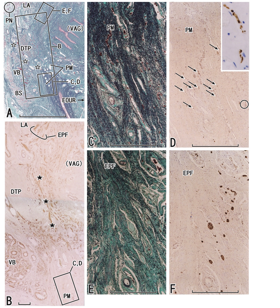 Figure 3. Frontal sections including the external orifice of the urethra as well as the deep transverse perineal muscle. An 81-year-old woman. Panel A (elastica Masson staining) displays the topographical anatomy of the perineal membrane (PM) in which elastic fibers originate from a fascia (open stars) between the deep transverse perineal muscle (DTP) and the vestibular bulb (VB) and extend toward the external orifice of the urethra (EOUR). The anterior wall of the vagina (VAG with parenthesis) can be seen near the inferomedial edge of the levator ani muscle (LA). In panel B (immunohistochemistry for smooth muscle actin), smooth muscles in the endopelvic fascia (EPF) differ in direction from another muscle bundle (black stars) between the deep transverse perineal muscle and the vaginal wall. Panel C (elastica Masson staining) and panel D (immunohistochemistry for S100), corresponding to the square with CD in panels A and B, exhibit dense elastic fibers and thin nerves (arrows) in the perineal membrane, respectively. Insert at the upper angle of panel D is a higher-magnification view of nerves in the circle in panel D. Panel E (elastica Masson staining) and panel F (immunohistochemistry for S100), corresponding to the square with EF in panel A, display elastic fibers (panel E) and nerves (panel F) in the endopelvic fascia (EPF): the density and arrangement differ from those in the perineal membrane. Scale bars: 10 mm in panel A; 1 mm in panels B-F. BS, bulbospongiosus muscle; PN, pudendal nerve.