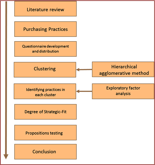 Several steps were applied in order to address the study objectives and test the study propositions (Figure 2). First, the preceding literature review discussed purchasing practices and identified the gap in existing literature addressed by this paper. Consequently, a survey questionnaire was developed based on the findings summarized in Table 1, followed by a hierarchical agglomerative clustering method to determine the appropriate number of clusters [96] . Exploratory factor analysis (EFA) using principal component analysis method was then used to extract and identify the practices in each cluster. The study objectives and propositions were then investigated.