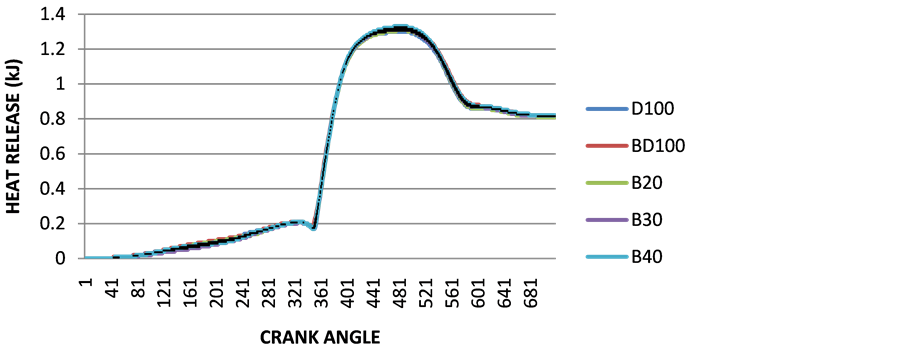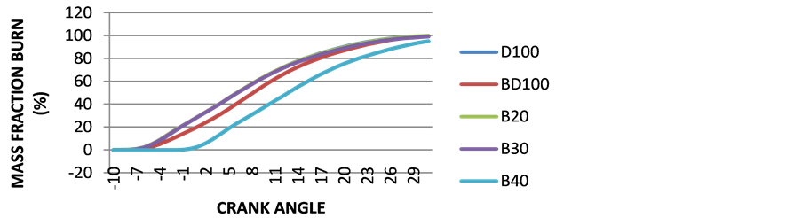 Figure 11 shows the variation of mass fraction burn in percentage with crank angle of various test fuels; D100, BD100, B20, B30 and B40. MFB curves follow the S-shape and all the fuels follow the same trend. MFB curves of D100, B20 and B30 coincides, it means both the fuels have same CD and heat release rate of D100. The MFB curves for B100 and B40 are distinct from that of D100, which means they have higher CD. So B20 and B30 are the better blends as compared to B100 and B30, the similar results were obtained by B. K. Venkanna, et al.