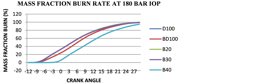 Figure 12. Variation of mass fraction burn with crank angle at 180 bar.