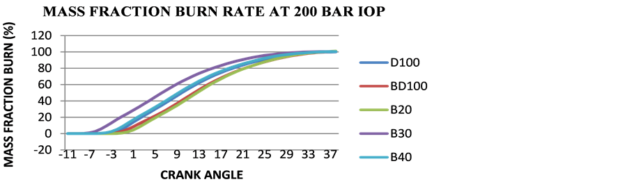 Figure 13. Variation of mass fraction burn with crank angle at 200 bar.