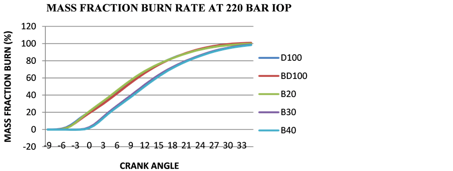 Figure 14. Variation of mass fraction burn with crank angle at 220 bar.