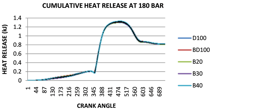 Figure 15 shows the variation of cumulative heat release of D100, BD100, B20, B30 and B40 with crank angle at 180 bar injection pressure. The graph shows all the modes of fuels fallow the same trend of heat release, and the maximum cumulative heat release for all the fuels is around 1.3 kJ. The maximum crank angle at which the maximum cumulative heat is released is around 480 deg. Hence the cumulative heat release of ternary fuel blend is almost same as that of pure diesel fuel; it may be due to leaner combustion of the biodiesel fuel and higher latent heat of ethanol.