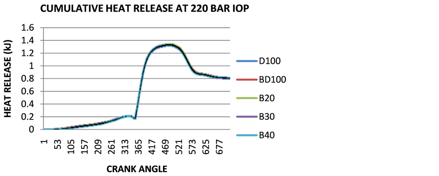 ・ Cumulative heat release is more for biodiesel and ternary fuel blends as compared with diesel fuel. Cumulative heat release is more at higher injection opening pressures. CHR increased by 1.5% to 2% when IOP increased from 180 bar to 220 bar.