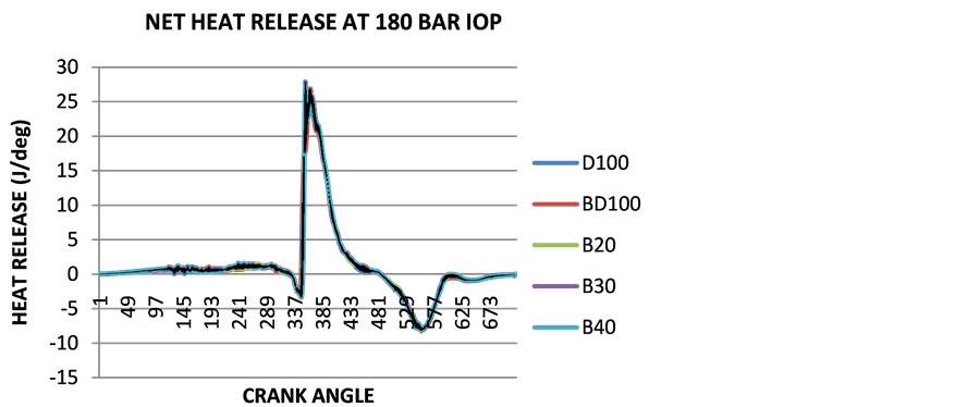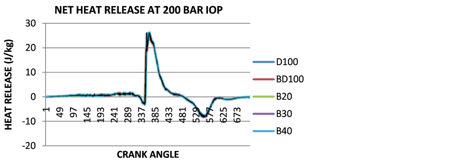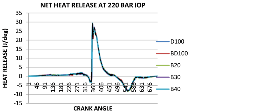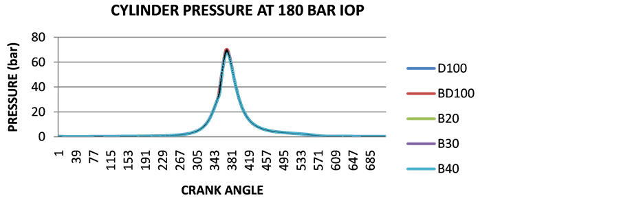 Figures 8-10 show the peak cylinder pressure at different injection opening pressure (IOP), 180 bar, 200 bar and 220 bar respectively. As IOP increases peak pressure decreases, it is due to higher IOP leads to shorter ignition delay, which in turn causes incomplete combustion and hence combustion efficiency falls down. B100 has highest peak pressure of 70.20 bar at 180 bar. It is due to leaner