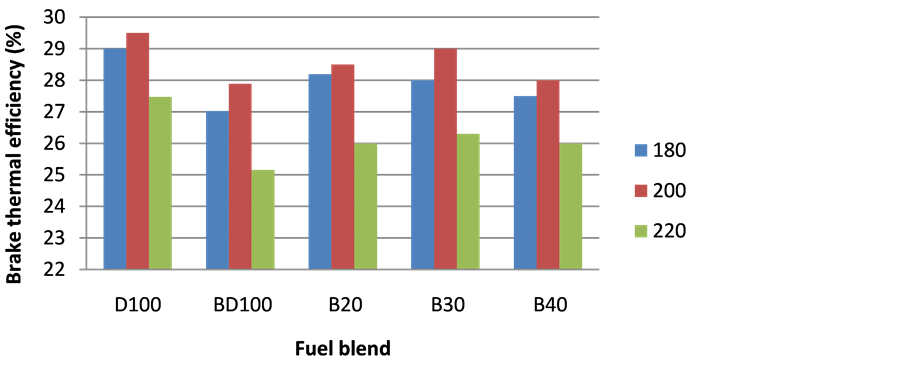 Figure 1 shows the variation of brake thermal efficiency of pure diesel (D100),