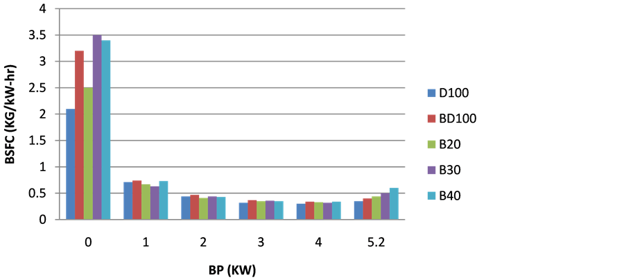 Figure 3 shows the variation of brake specific fuel consumption (BSFC) of pure diesel fuel (D100), biodiesel (B100), ternary fuel blends (B20, B30, B40) with BP. BSFC decreases with increase in load it’s due to better combustion at higher loads. BSFC of the fuels follow the same trend at all loads. The BSFC of the ternary fuel blends is slightly more than that of the diesel fuel and mahuva biodiesel it is because of lower heating value of the biodiesel and ethanol in the ternary fuel blends. Among the ternary fuel blends B30 has lowest fuel consumption.