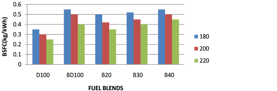 Figure 4 shows the BSFC of various fuels and fuel blends at different Injection pressures. Figure shows that BSFC decreases with increase in IOP; it is due to higher IOP leads to better atomization and through mixing of fuels, which leads to complete combustion and hence lower fuel consumption. At 220 bar IOP the BSFC is 1 kg/kW-hr less than at 180 bar IOP for modes of fuel. Hence