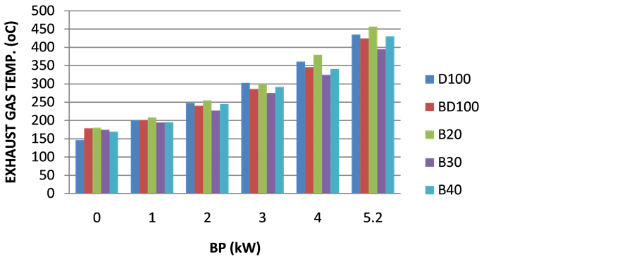 Figure 5 shows the variation of EGT of pure diesel fuel (D100), biodiesel (BD100), ternary fuel blends (B20, B30, B40). It is observed from the graph that exhaust gas temperature increases with increase in load; it is due to higher combustion temperature. EGT of ternary fuel blends are almost same as of diesel fuel at all load conditions; it is due to presence of ethanol which has high evaporative heat and low heating values, which takes off the heat from combustion chamber. At full load the EGT of all modes of fuel is around 450˚C.