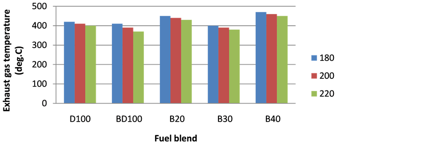 ・ Exhaust gas temperature reduces with increase in IOP; B20 has lowest EGT. At 180 bar B20 has 450 deg C. whereas at 220 bar it is 430 deg C.