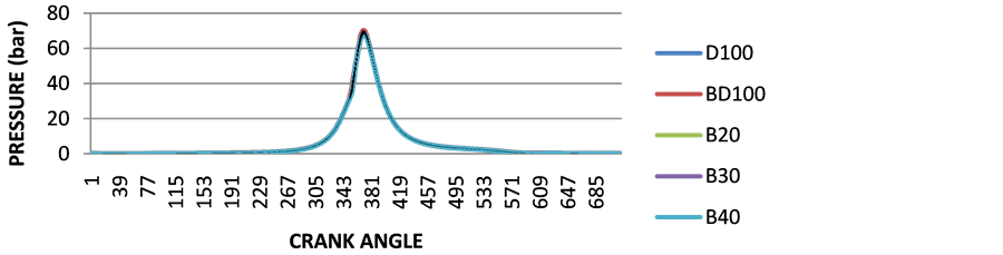 For D100, BD100, B20, B30 and B40 the peak cylinder pressure is 68.48, 70.20, 68.18, 68.46 and 68.40 bar respectively and occurs at the same crank angle 370 deg. The peak cylinder pressure of the ternary fuel blends is same as D100; it is due to the presence of ethanol in the ternary blend leads to superior fuel mixing and atomization which leads to lower ignition delay (ID) of the ternary fuel blends. It shows that, peak cylinder pressure increases with increase in biodiesel proportion in the ternary fuel blend; it is due to higher cetane number and leaner combustion of biodiesel.