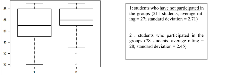 As for 2012/13, even for 2013/14, the statistical study of the data is purely descriptive and exploratory. From the comparison of the box plot (Figure 3) it is possible to confirm the result obtained the last year: the average rating received by the students of the second group is higher than the first group’s one, and in the second group there is a lower variability of the votes among the individual marks.