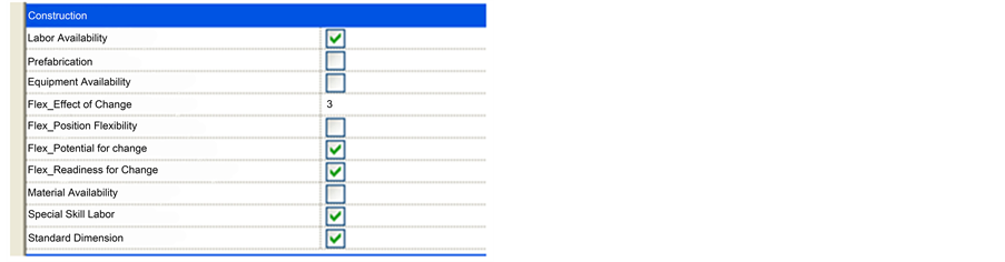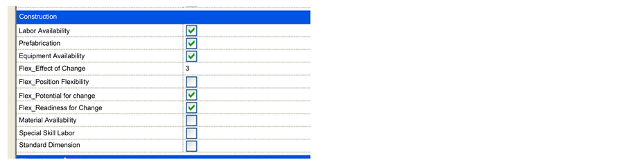 Standard Dimension: this factor checks all components of the buildings if its constitute parts have a standard dimension or not. The attributes are: Standard components, and Custom made components.