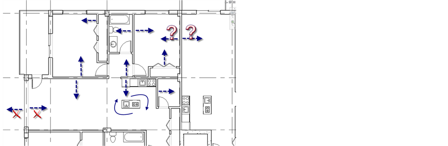 Component’s Flexibility: Flexibility rationales identified in previous subsection are interpreted in Figure 4. The dotted arrows shows that the designated internal walls have a potential for change concerning position, where the arrows with the cross sign found besides the external walls show that there is no potential for change. The arrows with question marks on the walls dividing the 2 apartments show that a decision must be made concerning the effect of changing the position of this internal partition on the two nearby spaces. Concerning building materials, each building component can be studied alone to figure out whether there is a potential for material change or not. The sink component in the kitchen can be revolved around its center and thus its position flexibility can be highly achieved. All of these analyses are made by the design team on the BIM model concerning a particular given design and then transferred to constructability input values. Input values can be made for each component alone or per family. For example, all internal partition walls with width = 125 mm and a fire rated protection = 2H can be considered as a single family and have the same constructability input concerning flexibility. Figure 5 shows how flexibility attributes’ values are recorded in BIM model. To improve flexibility of designs, designers have to check their building components against flexibility rationale criteria and record the findings in the modified BIM property panel for each design element.