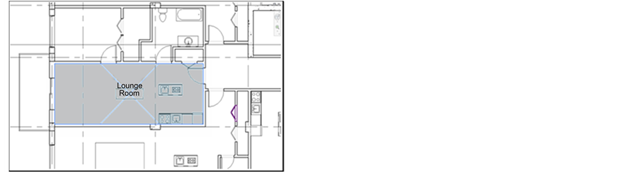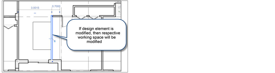 Automatic constructability rules: BIM parametric features are very helpful in identifying and modifying constructability aspects in a design. Parametric relationship between design components means that they have a logical interconnection between them. This aspect is considered one of the most important features of a BIM model. In other words, if the user changes a particular building component, any linked component to it will be updated automatically, thus preventing rework, reducing modification time and increasing accuracy of the design. Figure 6 shows a space annotation “Lounge Room” as a part of different spaces included in a
