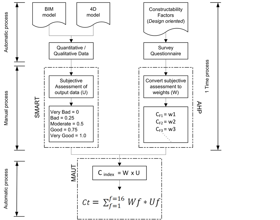 Singapore has pioneered in the field of quantifying constructability based on a scheme known as the Buildable Design Appraisal System (BDAS). The concept is based on a “3S” design principle in which a design is tested for constructability issues with respect to Standardization, Simplicity and Single Integrated Elements. A similar approach was used for assessing constructability proposed for the Hong Kong construction industry in 2007 [5] . A constructability multi-attribute system (BMAS) was developed for assessing constructability of designs in Malaysia [8] . The assessment was based on 6 principles with identified factors for each principle which were developed through a literature review, questionnaire survey and brainstorming sessions. Another assessment method based on cognitive models (CM) was proposed for constructability assessment for steel frame structures [9] . It was based on the use of interviewing techniques to understand problem solving and the development of knowledge models for automated constructability assessment. [10] developed a fuzzy Quality Function Deployment (QFD) system to support constructible design decision making. It provided a systematic and structured method to support the integrated decision-making process of constructible designs, and applied a fuzzy set theory to facilitate the processing of design-relevant QFD information.