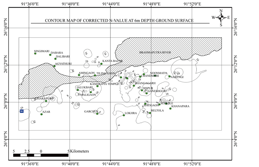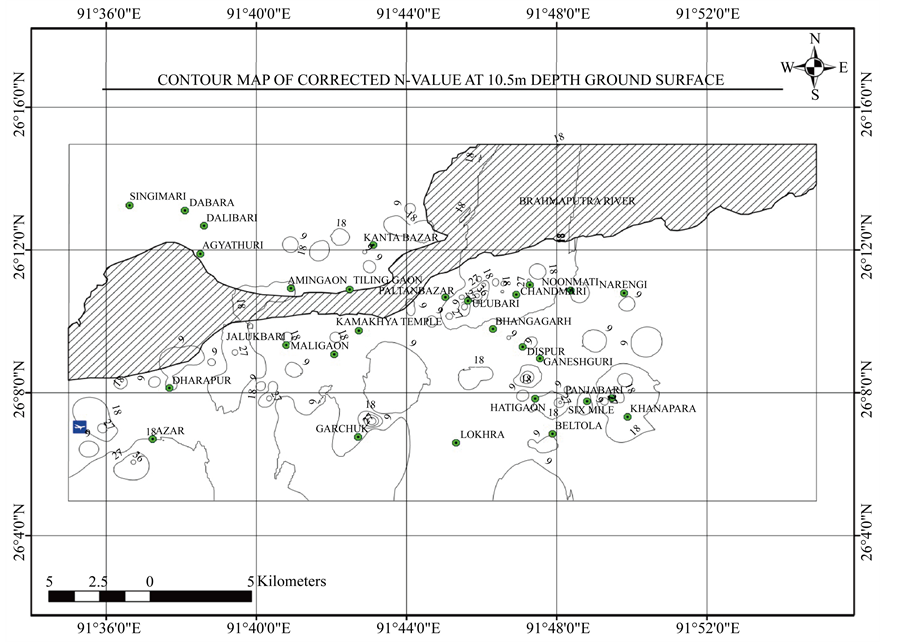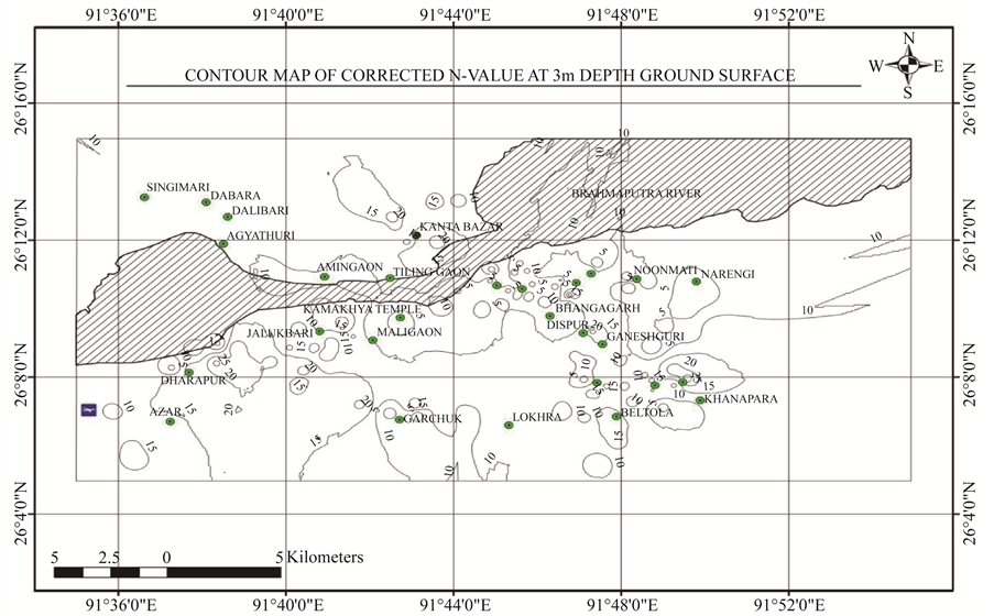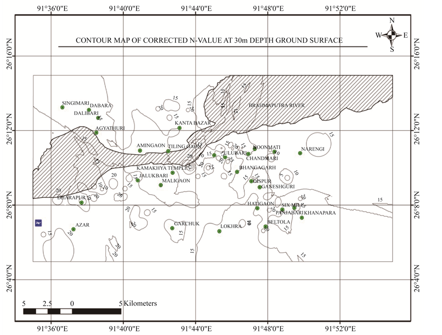 Phukan et al. (2004) [2] studied the Guwahati city areas for multi criteria evaluation in GIS environment for ground water resource mapping in Guwahati city areas. Matsuoka et al. (2005) [3] studied the soil of Japan and prepared average shear-wave velocity mapping using Japan engineering geomorphologic classification map. Maheshwari et al. (2010) [4] studied the soil of Chennai and developed an empirical correlation between shear wave velocity and standard penetration test N value for the soil of Chennai city. Ribeiro et al. (2007) [5] studied the soil of Brazilian port site for geotechnical mapping and reports about N value contour mapping at Brazilian port. Humyra et al. (2012) [6] studied the soil of Rajshahi for the preparation of SPT N value contour map of Rajshahi city area. In the study they used 21 soil reports of Rajshahi city prepared by civil engineering department of Rajshahi University of engineering and Technology. Ayothiraman et al. (2012) [7] also developed average N value (15m) contour map of Guwahati city. Rao (2012) [1] studied and estimated shear wave velocity from soil indices. In the study, in situ Vs measured by cross-hole technique at six sites have been compared with those evaluated using an existing empirical relation between N value, soil indices and shear wave velocities. A new, modified empirical relation for predicting Vs from N values and other soil indices has been proposed. Other research workers in this direction are Imai and Yoshimura (1970) [8] , Sykora and Stokoe (1983) [9] , Jafari et al. (2002) [10] and Ismet, K. A. et al. (2006) [11] .
