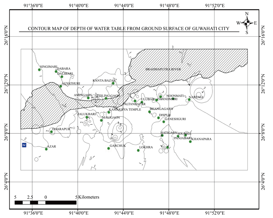 The contour map of depth to ground water level in Guwahati city is shown in Figure 7. The map in Figure 7 in-