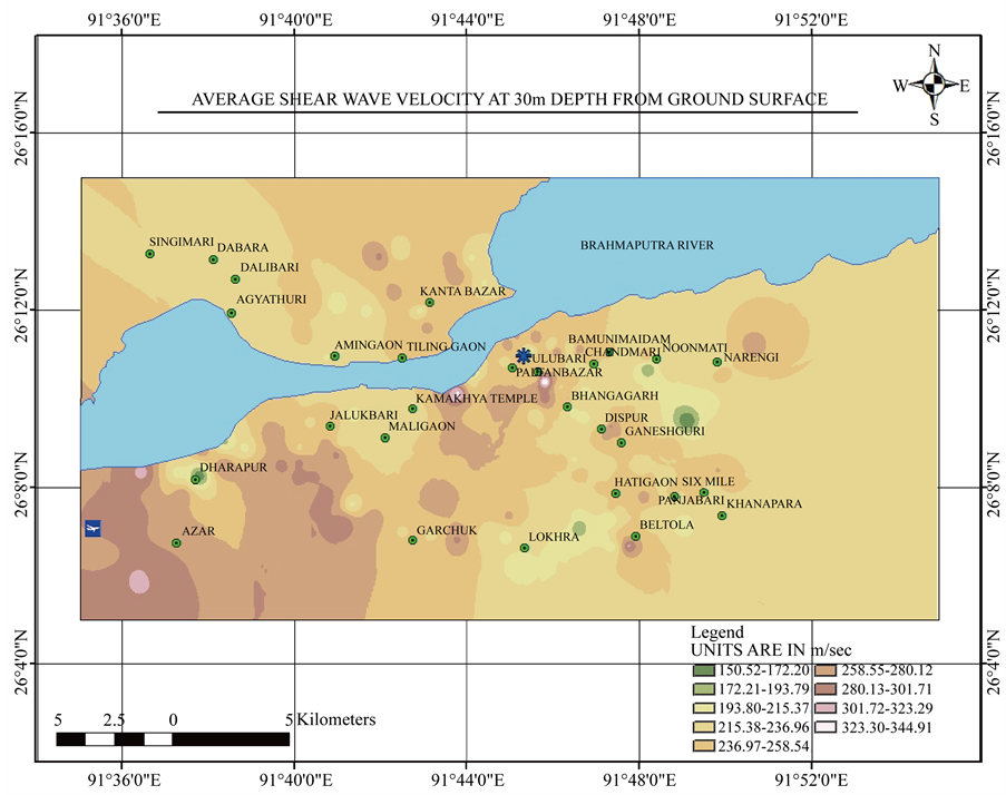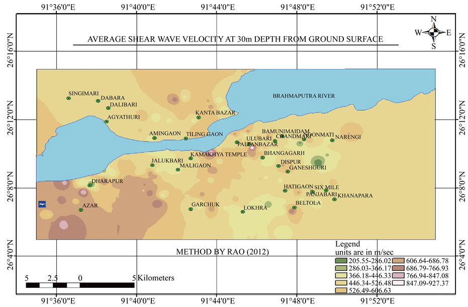 When average shear wave velocities of Guwahati city are calculated by Equation (2), then out of 200 boreholes in Guwahati city 6 sites belongs to class E and 194 borehole sites comes under class D. According to Rao (2012) [1] , out of 200 boreholes 11 site belongs to class D, 183 sites belongs to class C and 6 site comes under class B. On going through the bore logs of the 200 bore holes it is seen that Guwahati soil consists of alternating layers of both fined grained and coarsed grained soils with N-value ranging from 4 to >50 (refusal). Ninety seven number of bore holes showed existence of very dense sand strata from depth ranging from 12 m to 22.5 m up to 30 m showing N-value as refusal. Again seven number of bore holes have gravel deposits from depth ranging from 17 m to 22 m up to 30 m. Bed rock was not encountered in any of the 200 borings in Guwahati city. This gives the impression that Equation (3) according to Rao (2012) [1] is overestimating the shear wave velocity and Equation (2) is underestimating the shear wave velocity of Guwahati city.