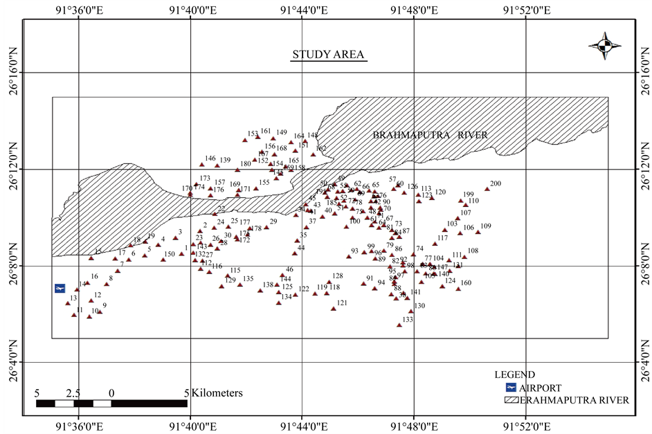 In order to study the engineering soil properties of Guwahati City soil, bore holes of 30m depth were made in 200 locations covering an area of 262 sqkm. The bore hole location map along with the river Brahmaputra in Guwahati city is shown in Figure 1.
