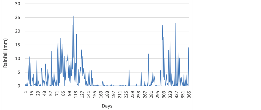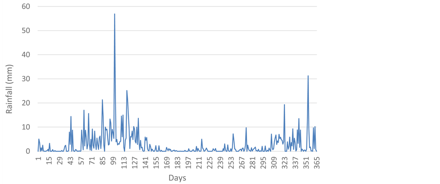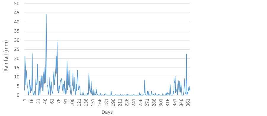 The analysis was performed using a simple daily water balance model with an overall cumulative water storage Equation (1). This incorporates the performance parameters for dry season quantification, NWD, RUR, and WL (Equations (2) (3) and (4a)), defined by [9] . The authors considered all 365 days of the year, even though the site is a day school. Average daily rainfall data were used (Figure 2). Both fixed and variable demand conditions were considered. Variable demand was considered under water level monitoring strategy, Equation (4b) [8] . Equations (5) and (6) are the basic demand conditions.