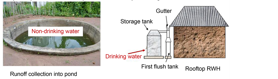 For ensuring sufficient demand satisfaction, not only is pond covering recommended but having a simple rooftop RWH system is as well. These can be relied on in a dual manner, with drinking water taken from the RWH system and pond water used for nonpotable purposes to address quality concerns (Figure 4). RWH systems are a possibility as most households in this village had at least one building with an iron roof, even
