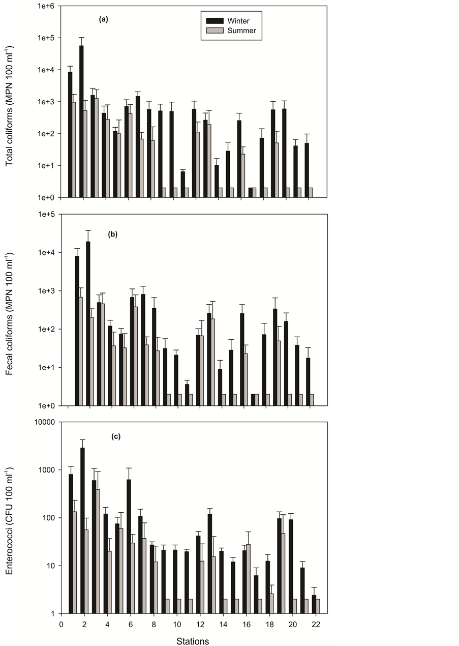 Figure 2. (a) total coliforms; (b) Fecal coliforms; (c) Enterococci bacterial concentrations (mean ± standard error) for summer and winter.