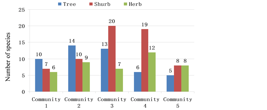 4 and 5. As seen in community 4, although the number of species reached 19, it was lower than that in community 3, but was higher than that in communities 1 and 2. In the two communities of Chiao, most of the species were shrub and herb, while the number of tree species and its proportion were distinctly low, indicating that in the man-made interference community, shrub and herb were the main components. Therefore, to compare the diversity of natural or half-natural forests with that of artificial forests, analysis should be done on not only the diversity index, but also species proportion and composition in every layer.